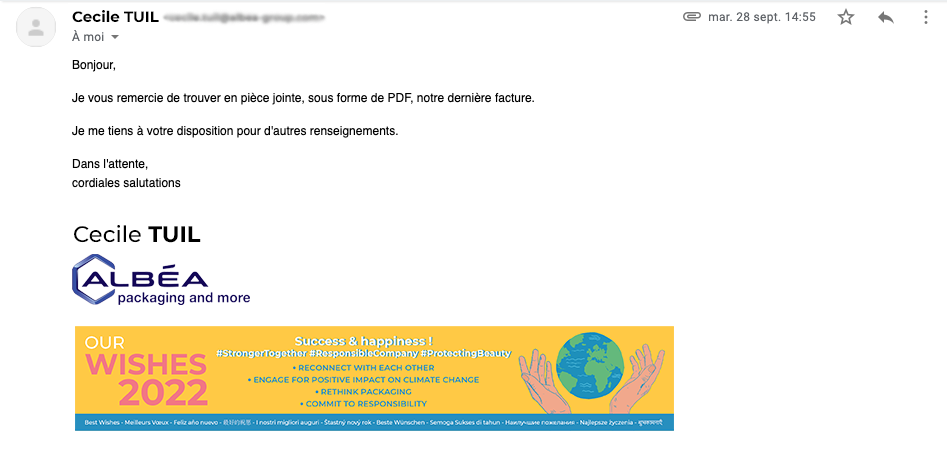 Réponse à l'appel d'offre Albéa ( fournisseur d'emballage cosmétique) pour sa carte de voeux 2022 déclinée en signature mail sur le thème de la conduite responsable des entreprises