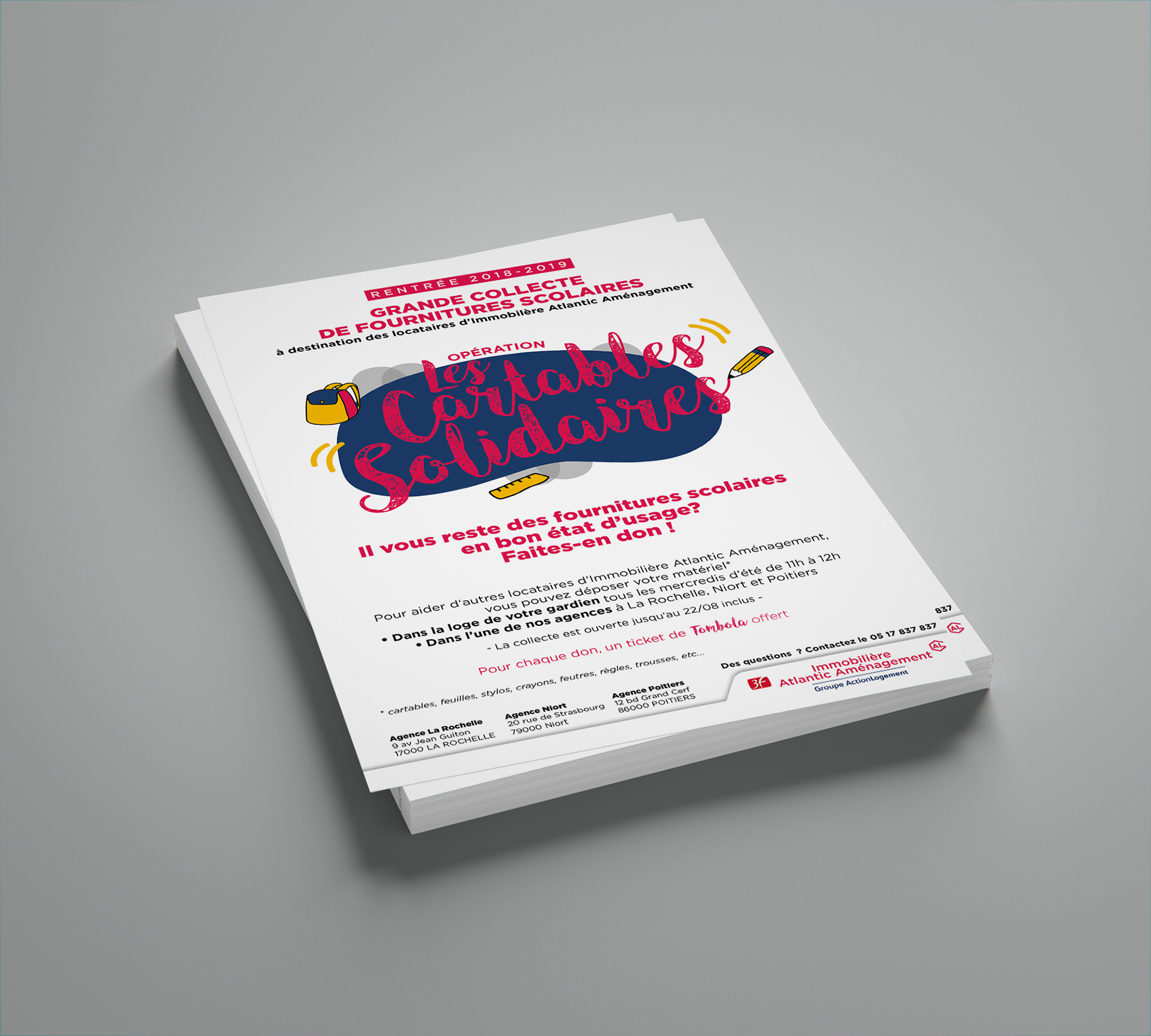 Projet "Cartables Solidaires" Logo et déclinaison flyers A5 pour le bailleur social Immobilière Atlantic Aménagement